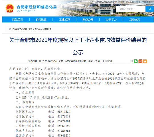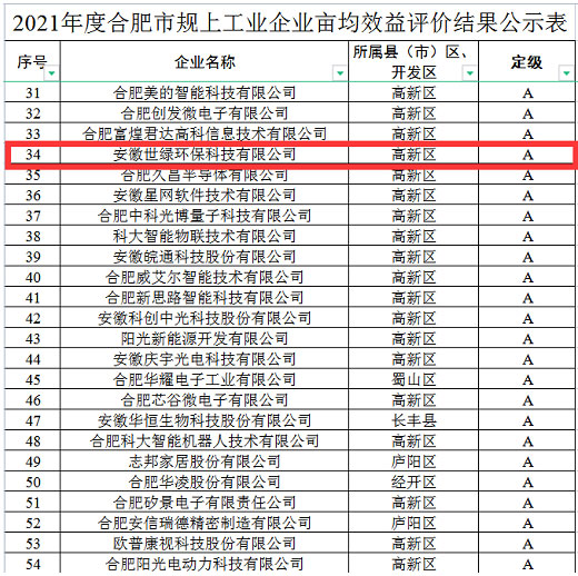 不以規(guī)模定標準,而以“畝均論英雄”。近日,根據(jù)《合肥市工業(yè)企業(yè)畝均效益評價辦法(試行)》(合畝均辦〔2022〕2號)文件規(guī)定,合肥市畝均效益評價工作領(lǐng)導(dǎo)小組辦公室對全市1977家規(guī)模以上工業(yè)企業(yè)2021年度畝均效益情況進行了綜合評價,共評出A類企業(yè)414家,B類企業(yè)896家,C類企業(yè)575家,D類企業(yè)92家。經(jīng)市畝均效益評價工作領(lǐng)導(dǎo)小組會議研究通過,將評價結(jié)果予以公示。安徽世綠環(huán)保科技有限公司在此次綜合評價中,被評為A級。